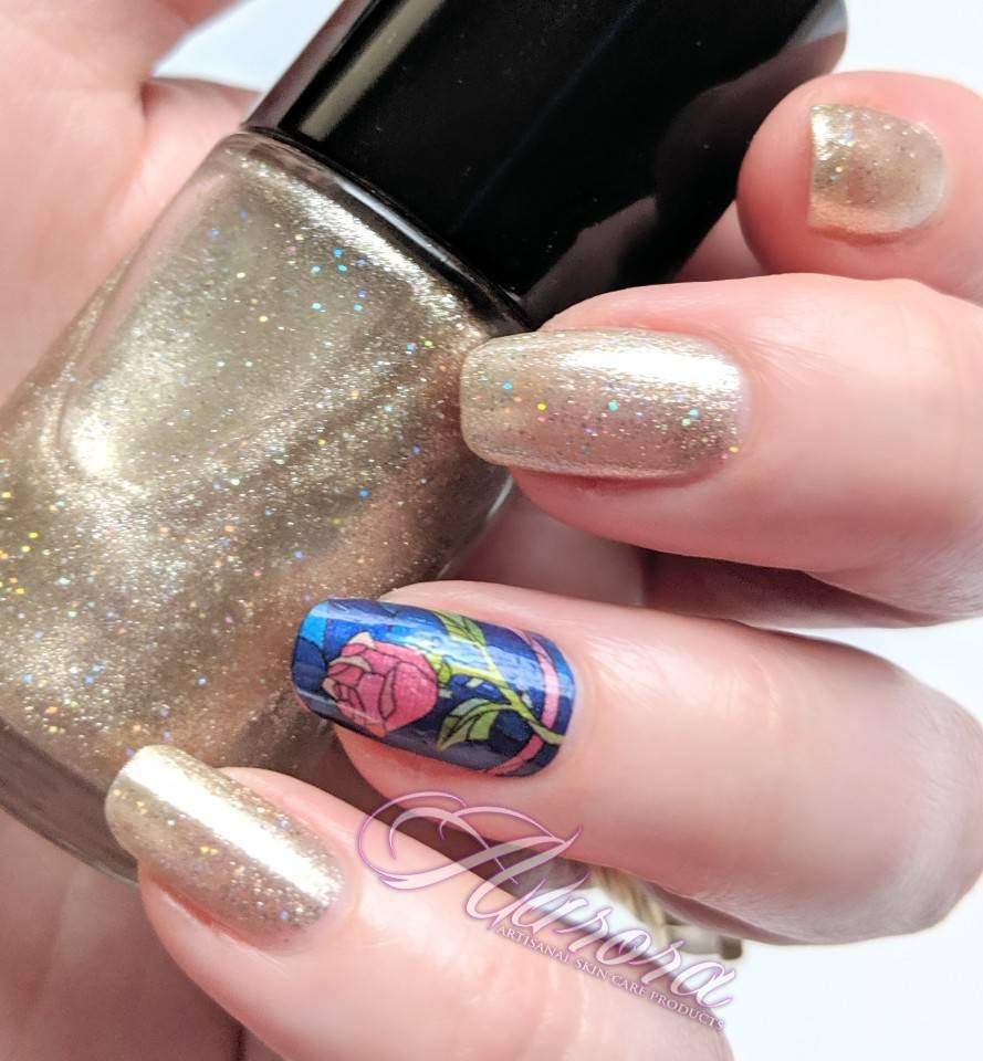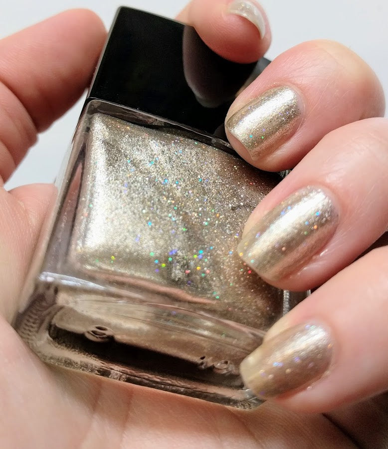 Enchanted Mirror is a lighter, gold metallic polish. It can be slightly sheer, but the holographic glitter makes it pop!
